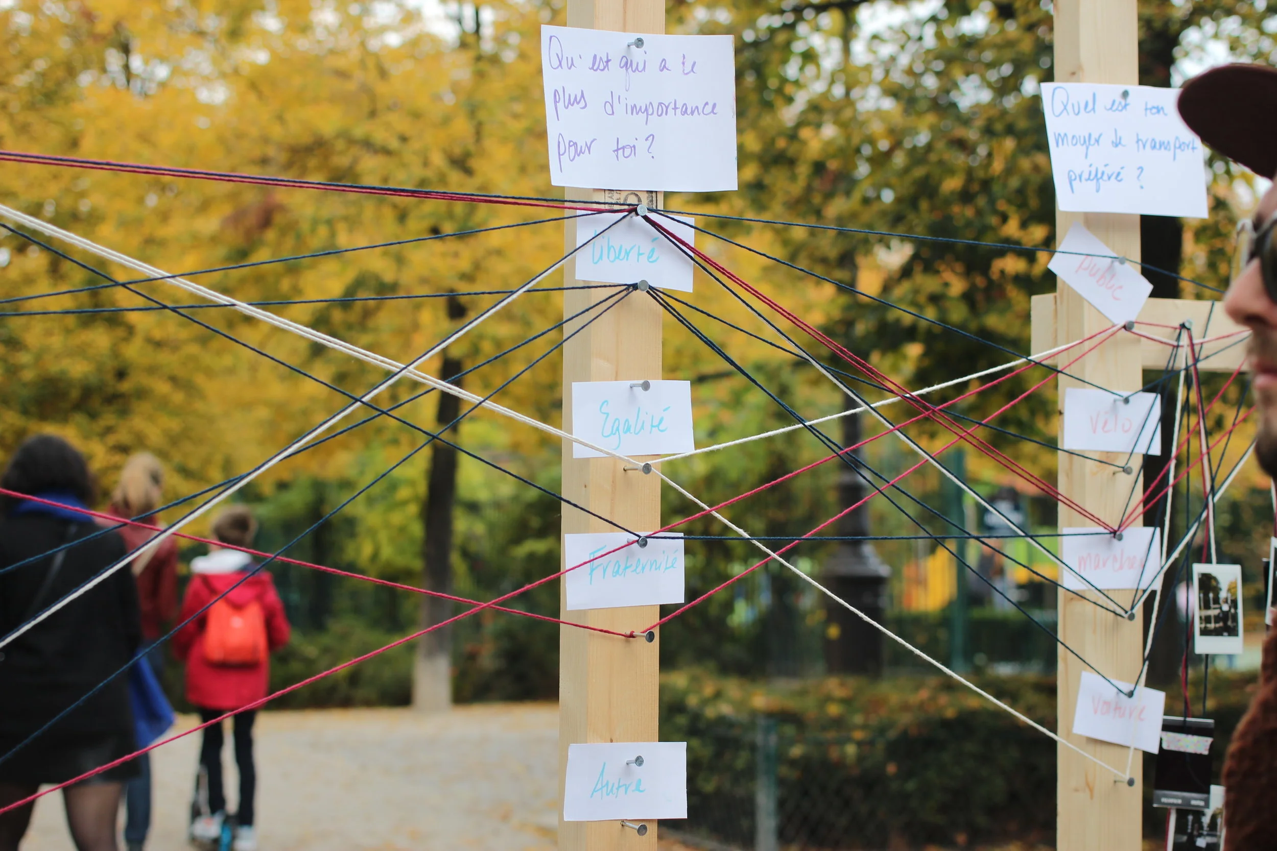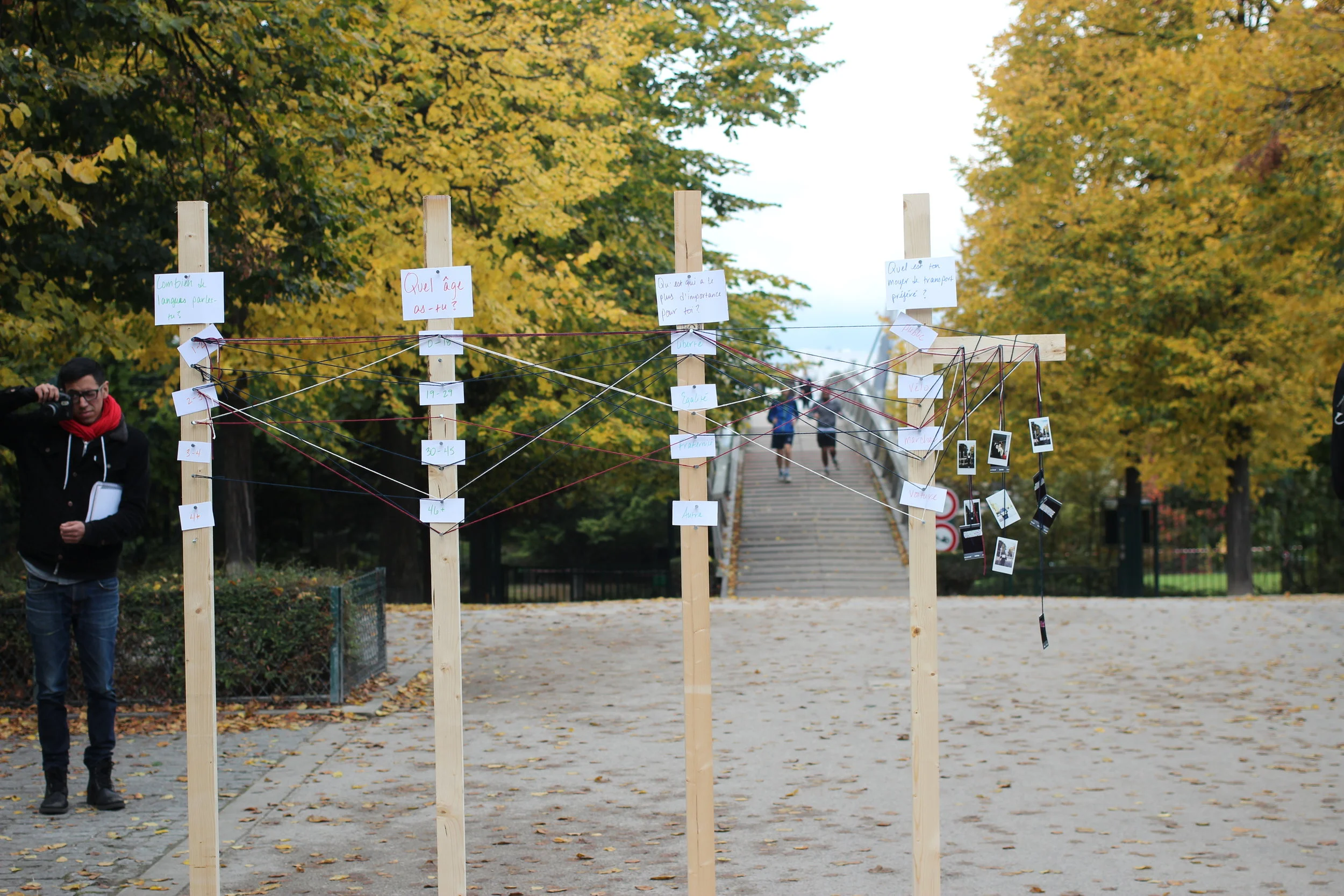 The installation featured four 6 ft posts. Each post had a question at the top of it with four possible answers. Each question related to something about the individual's preferences. We asked participants to pick a string and loop the string along answering the questions til they reached the end. The last post featured an "arm" when the string would hang down. We then gave the people one last question "describe yourself in one word" and asked them to write the word down largely on a piece of paper and we would photograph them three times: one digital and two Polaroid photos. One Polaroid was to be attached to their string answers and one was for them to keep as a memory.