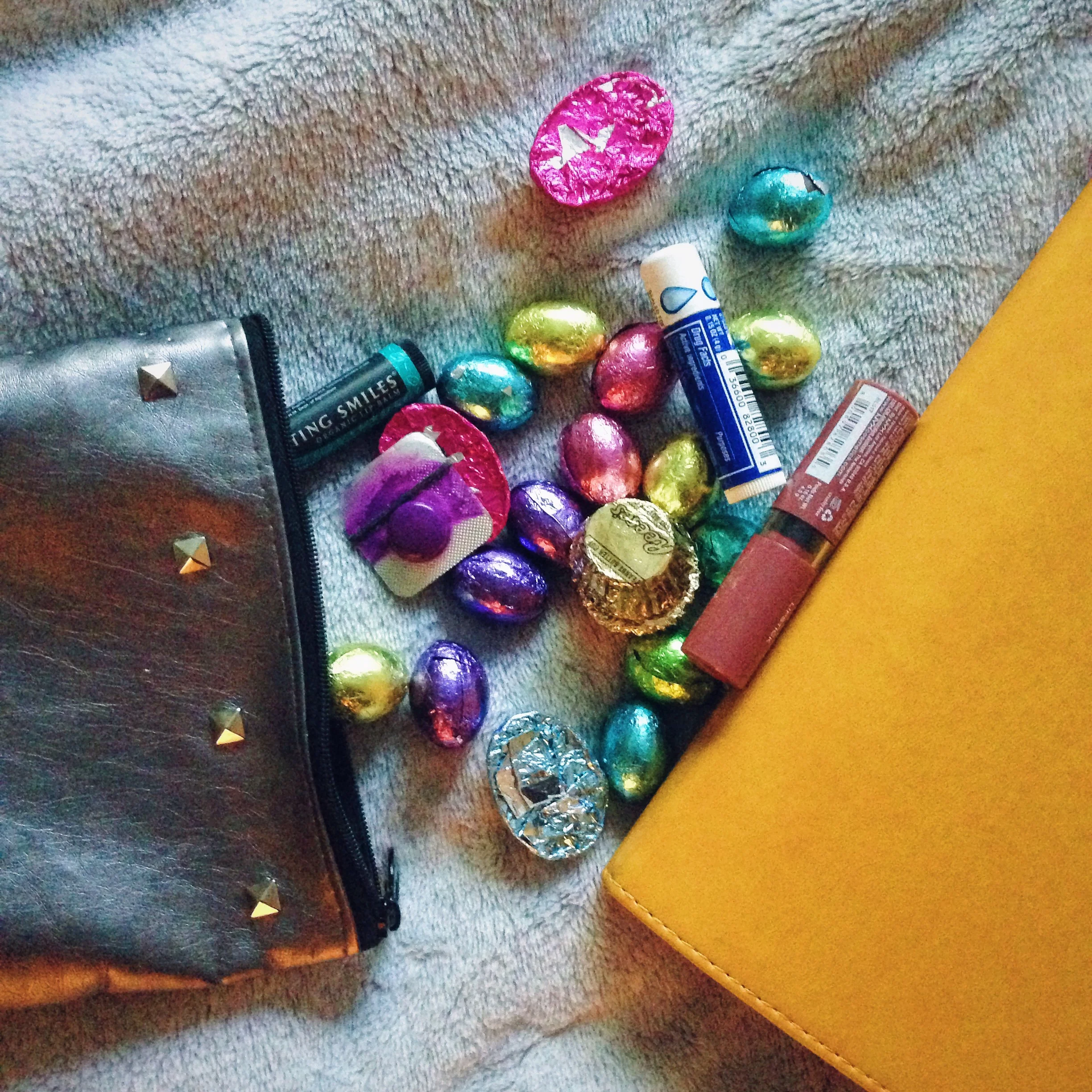 This was my bed one morning after I dumped out a small makeup bag. Just Chapstick and chocolate (Easter spoils!).