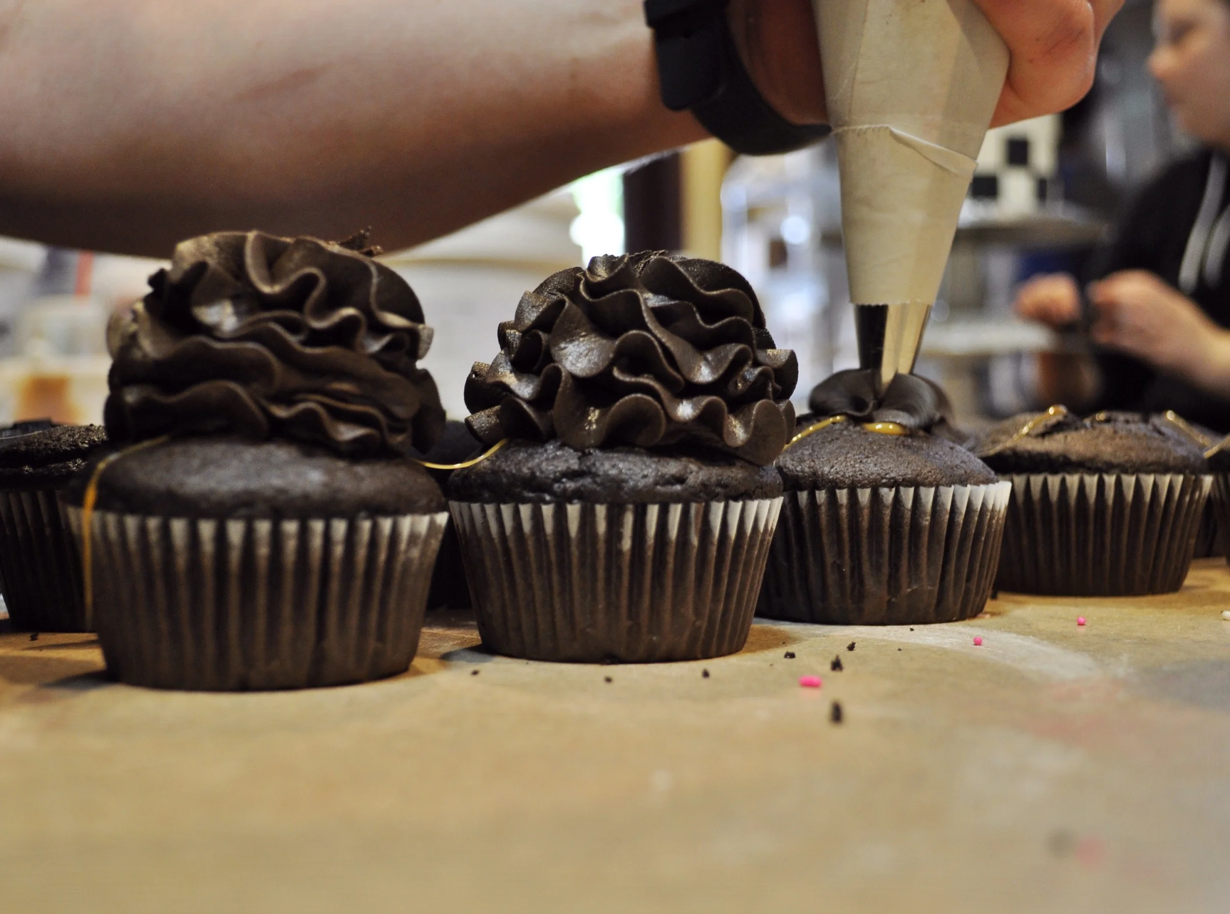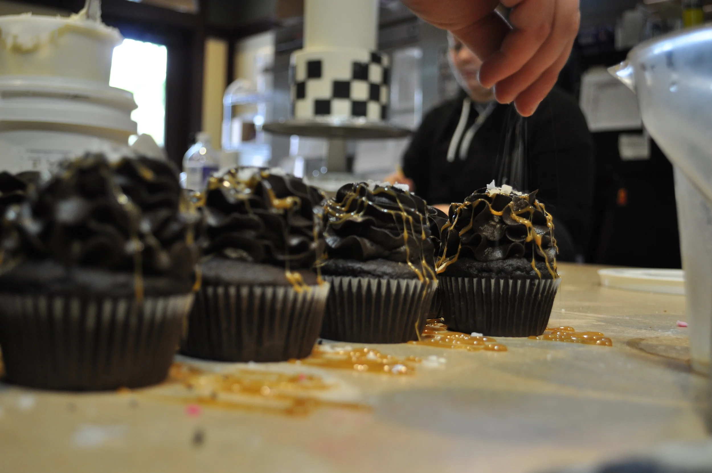 Cupcakes in decorating progress at work. A very fun process to watch.