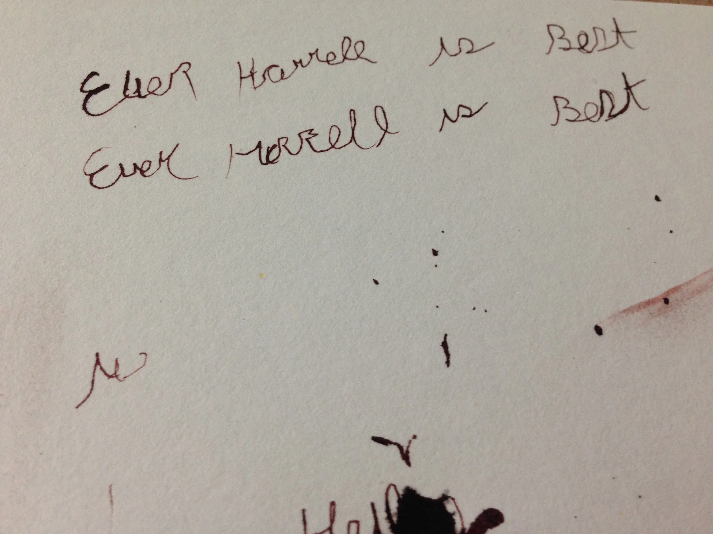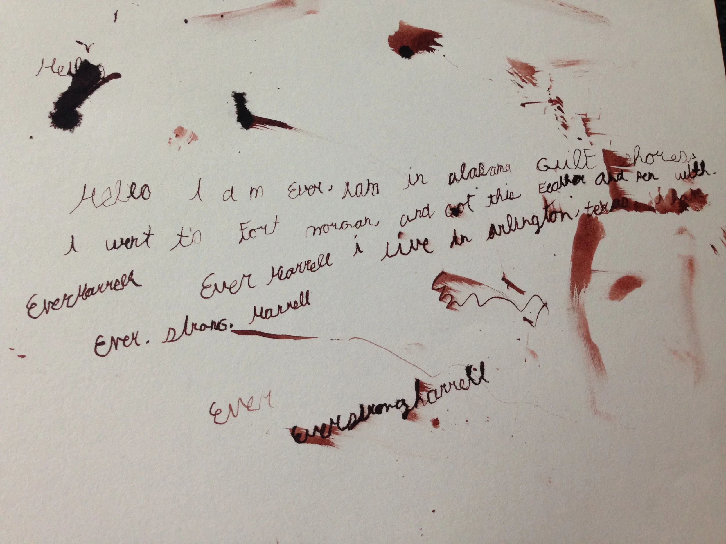 Ever got a quill feather pen and ink set and was practicing his penmanship. I think the ink looked TOO MUCH like blood. Here is his practice sheet