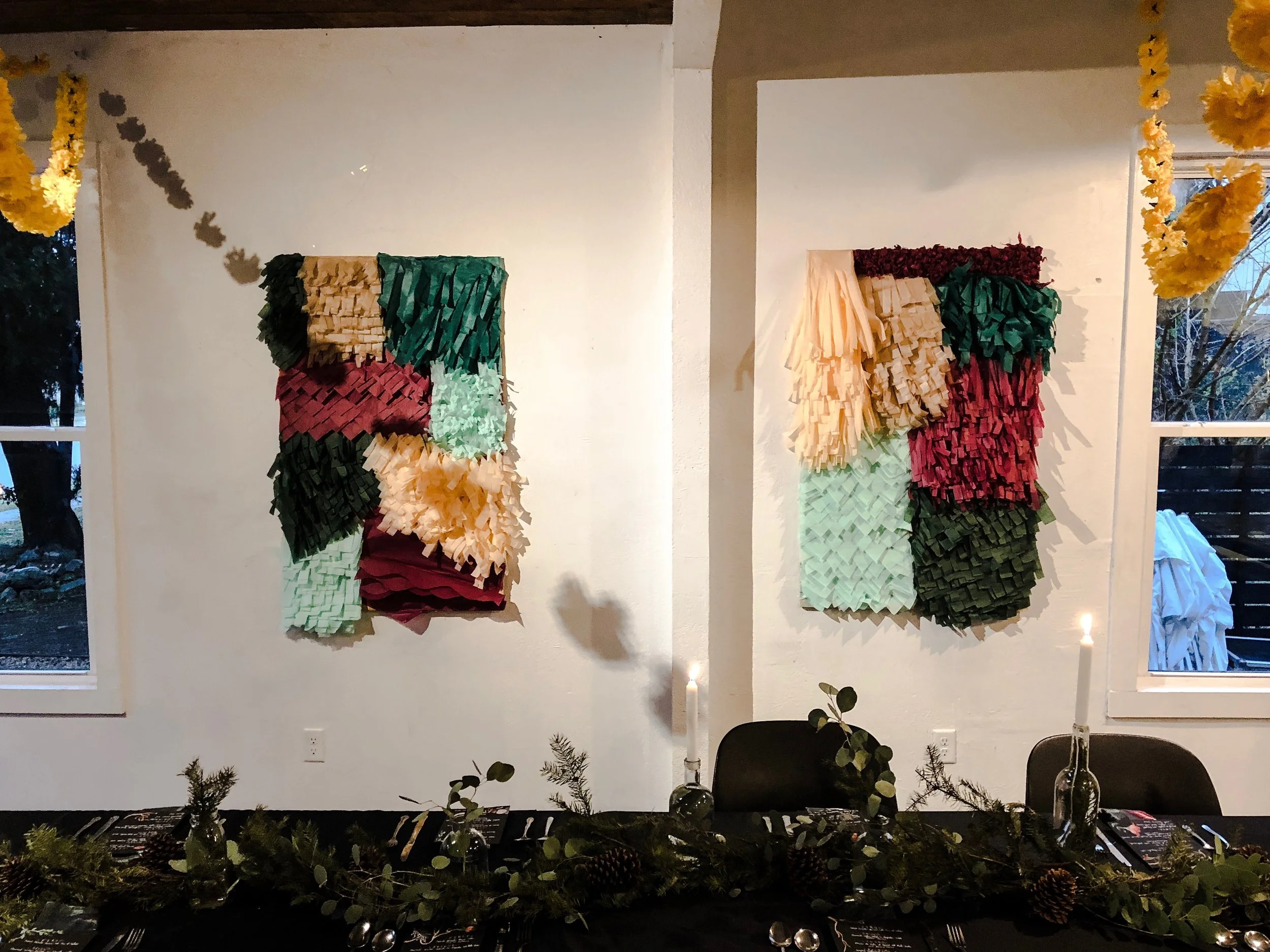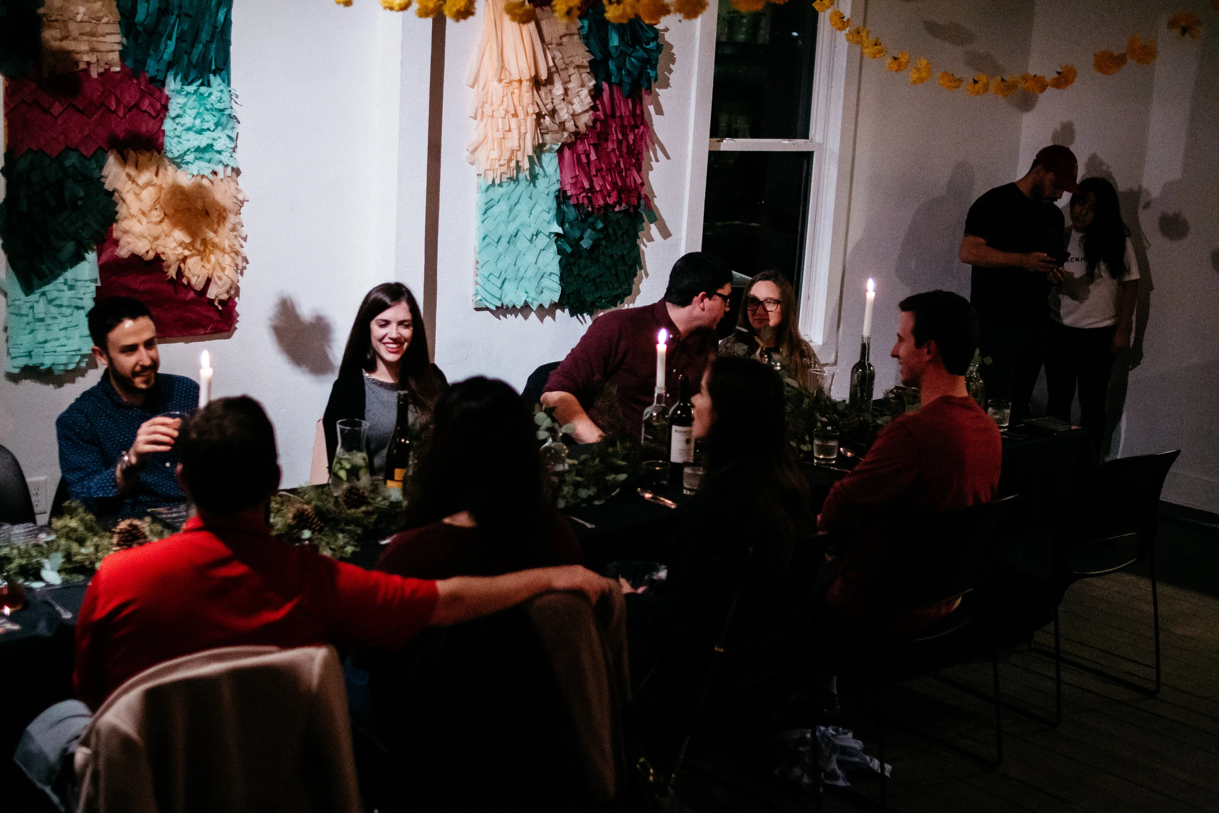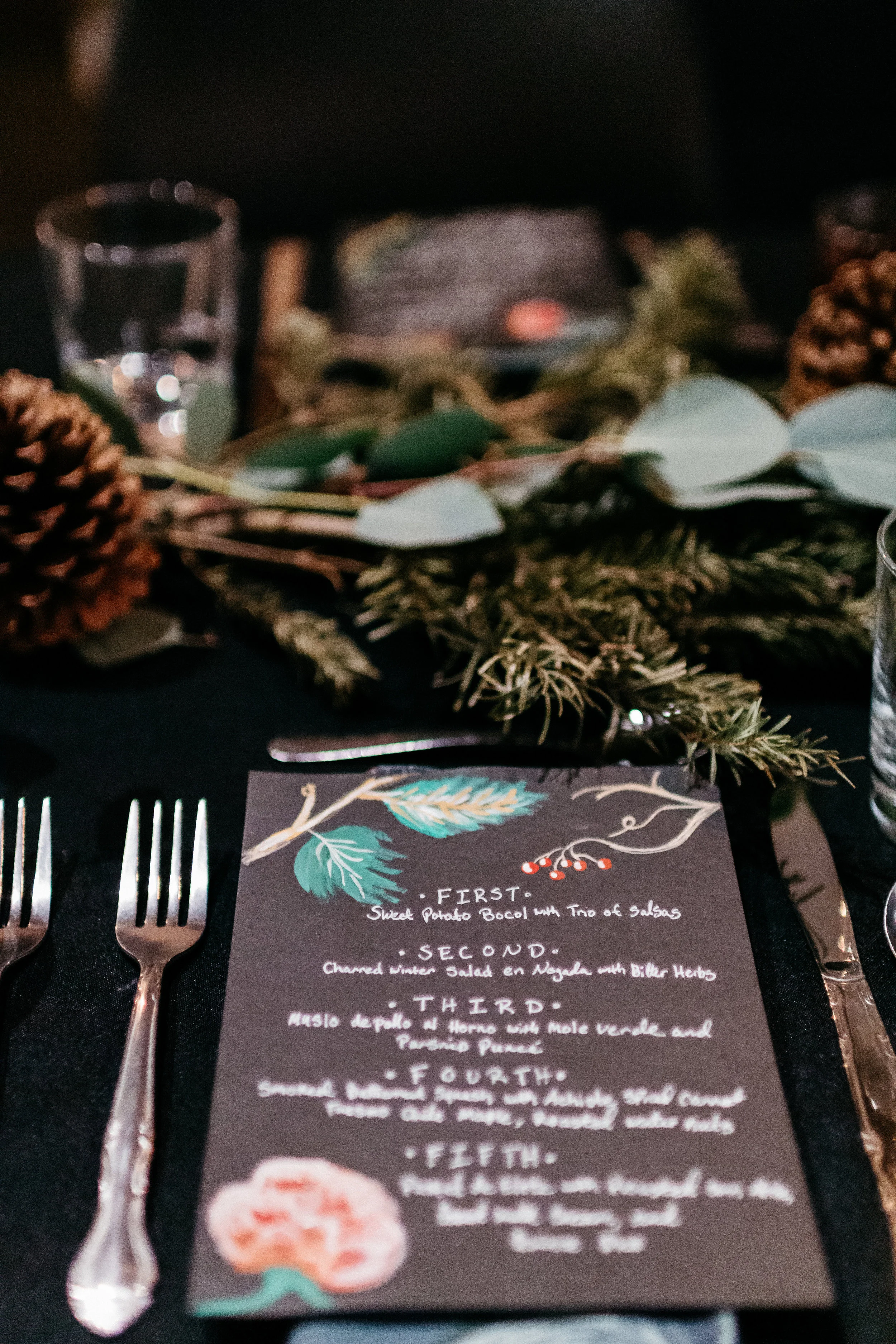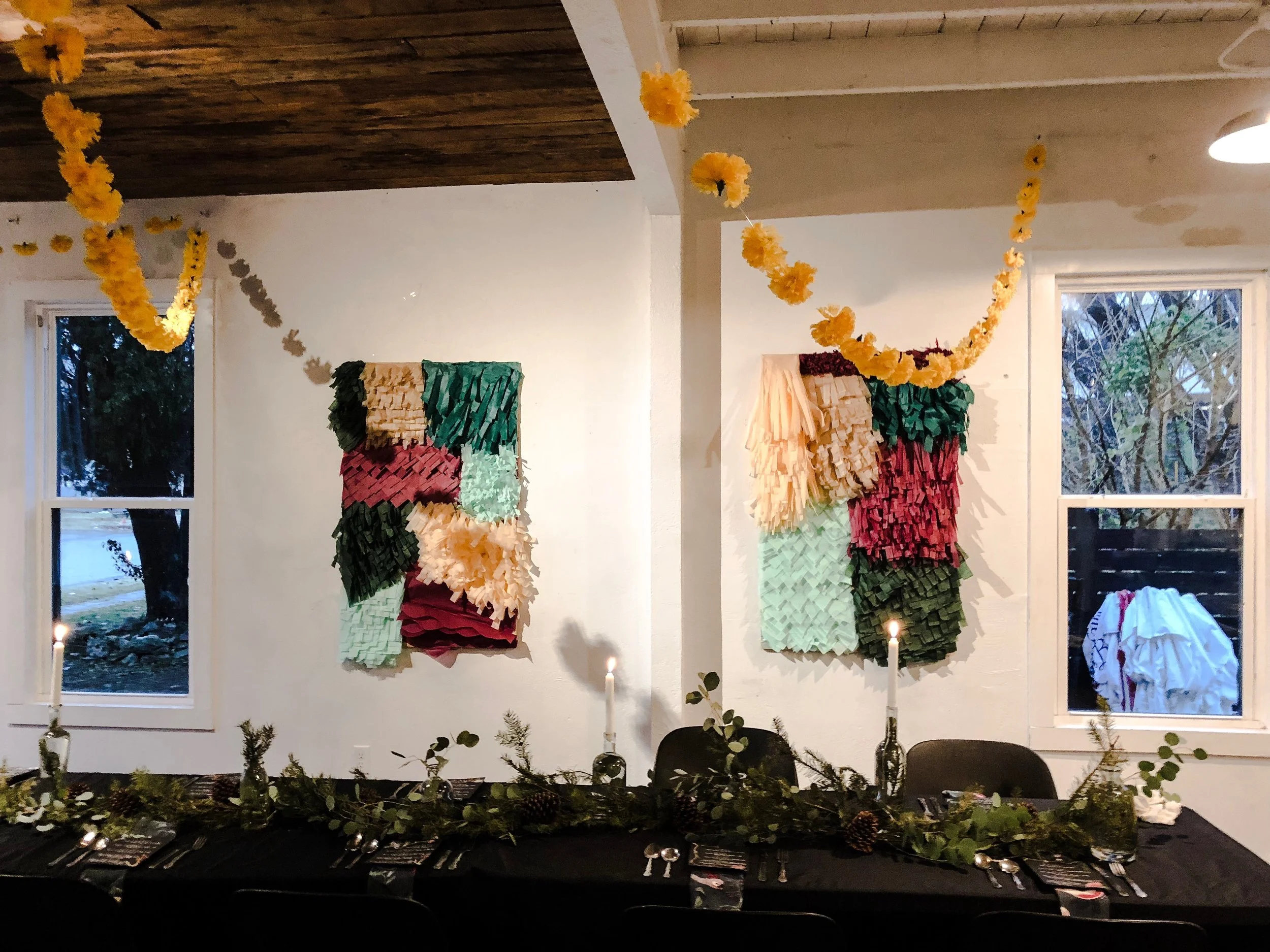 The design was based around the Spanish menu and the idea of having a christmasy feel to the event - without being too in-your-face-commercialized christmas. We landed on the muted tones of red, gold, tan, wine and a tones of green to be dusted in the pinata-inspired wall art, a slight nod to Ofrendas with the marigolds dangling from the ceilings, and hand painted menus to match the napkins - each featuring a totally different and unique design! Styling this dinner was one of my favorite projects to date!