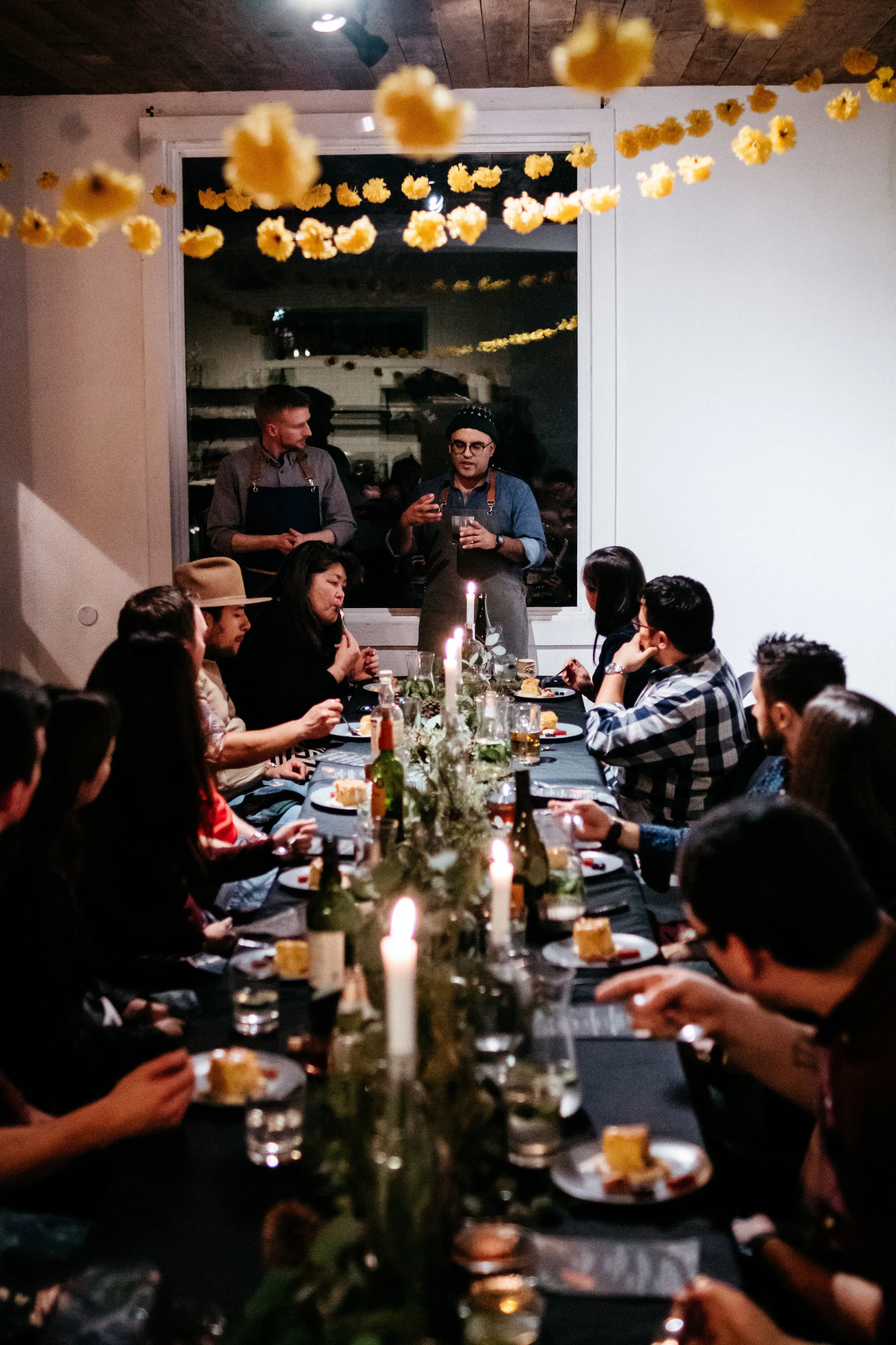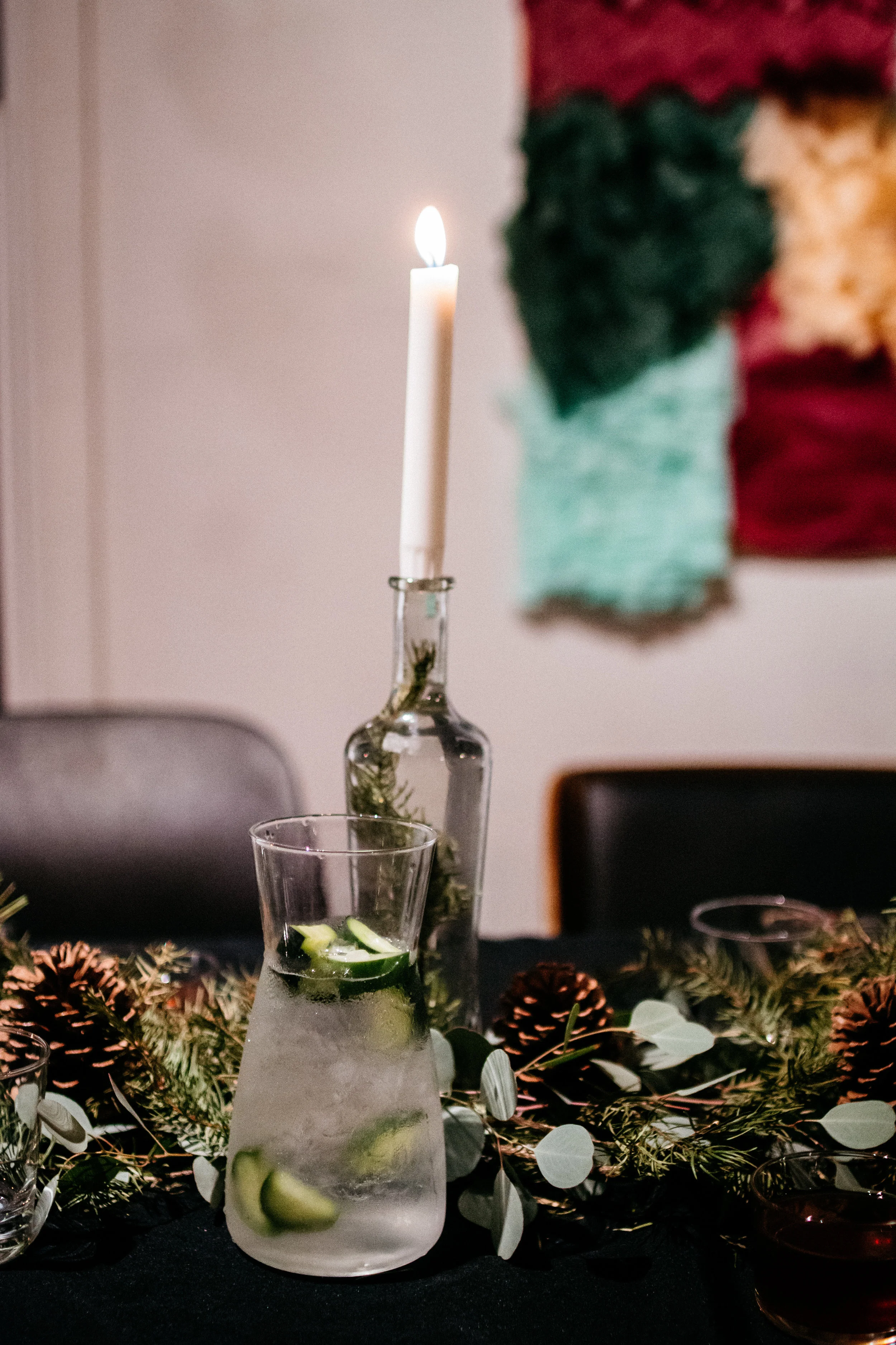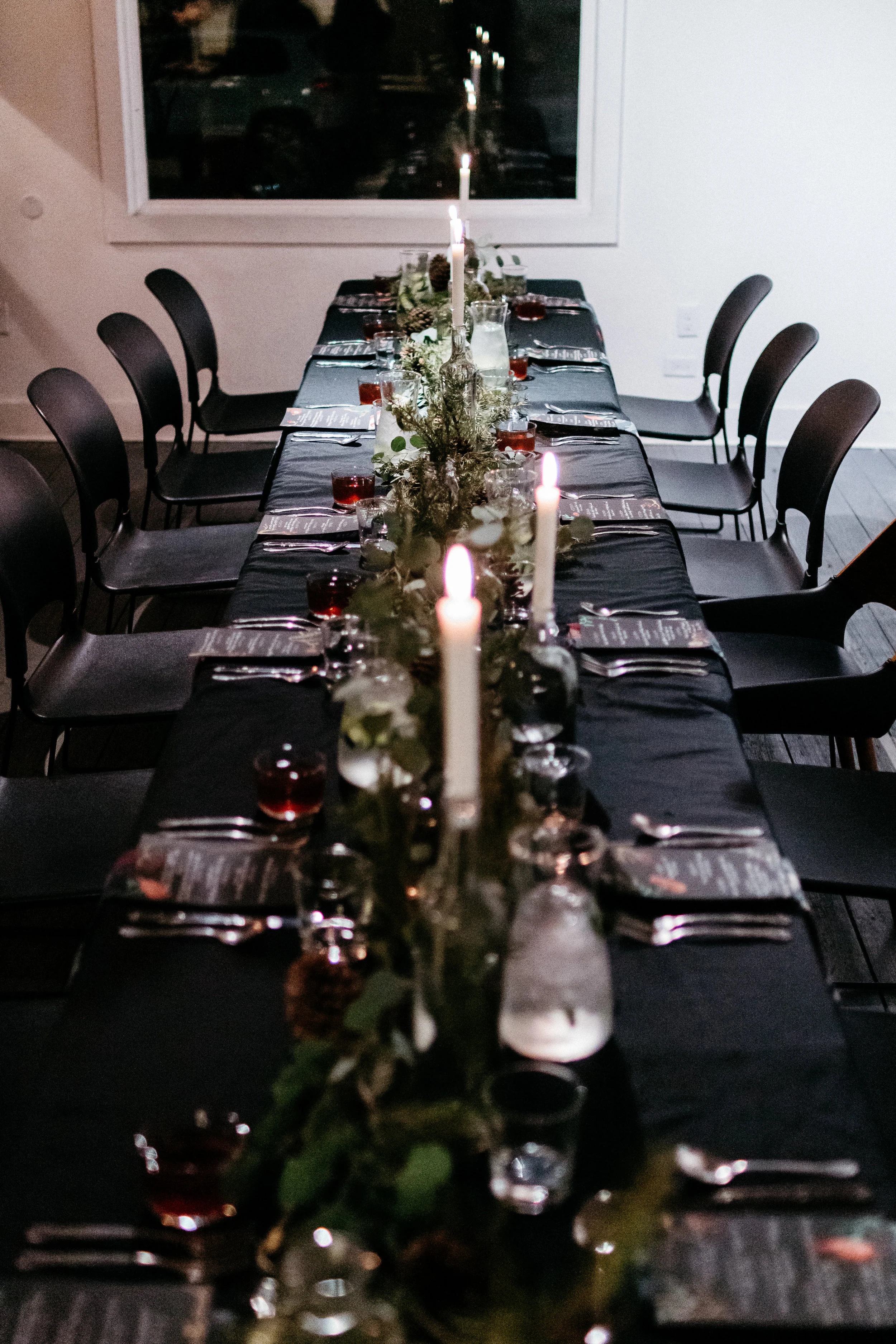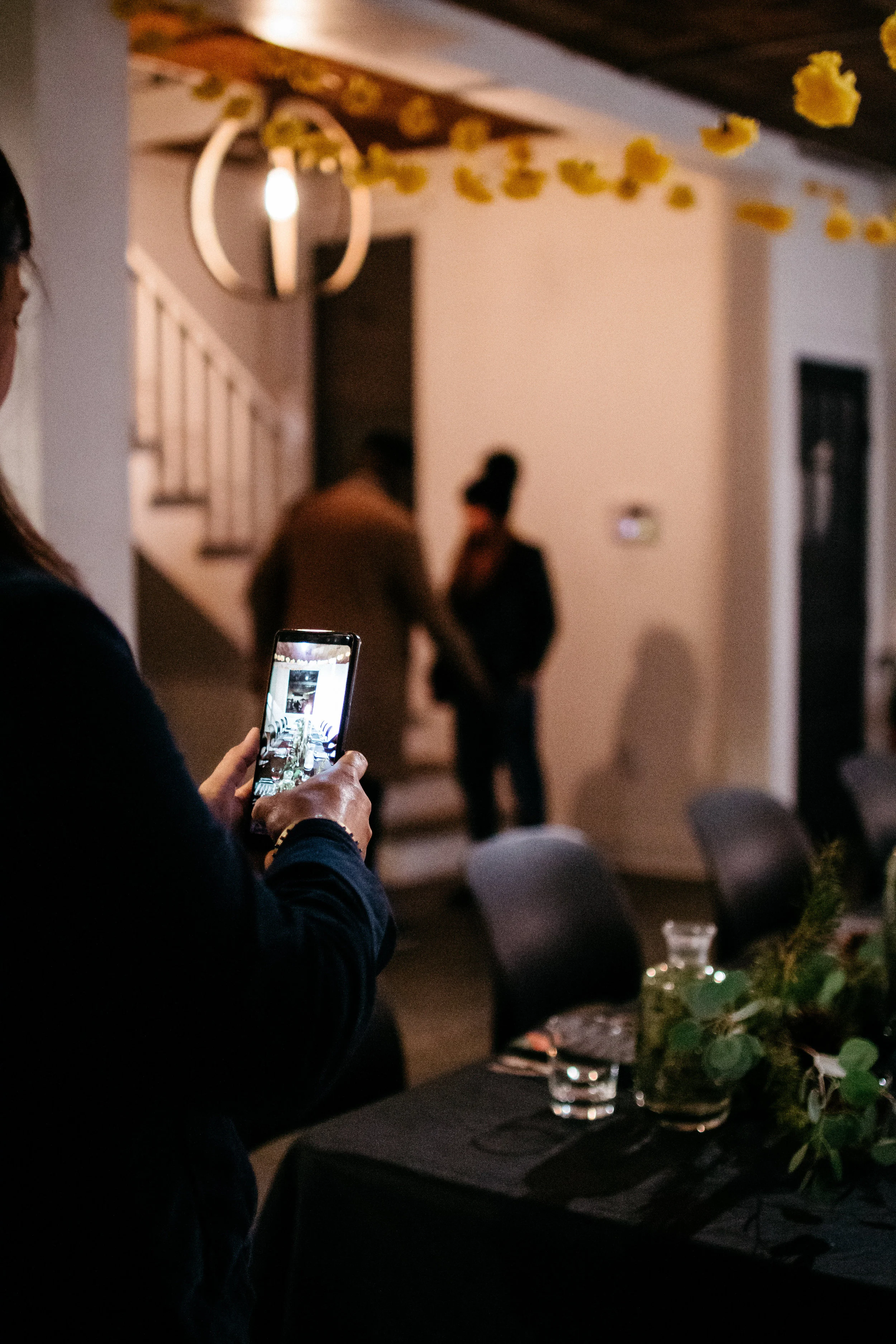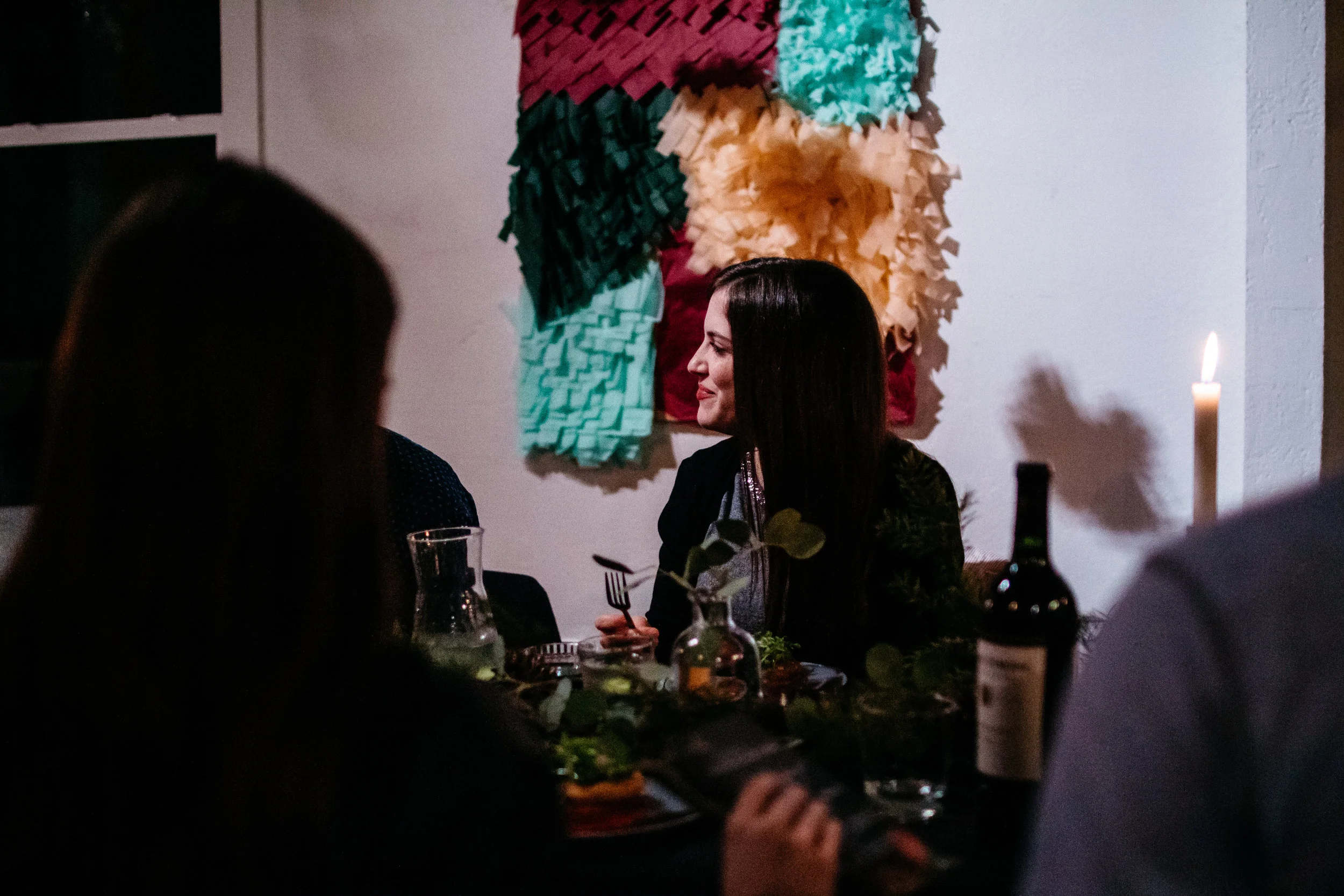 The design was based around the Spanish menu and the idea of having a christmasy feel to the event - without being too in-your-face-commercialized christmas. We landed on the muted tones of red, gold, tan, wine and a tones of green to be dusted in the pinata-inspired wall art, a slight nod to Ofrendas with the marigolds dangling from the ceilings, and hand painted menus to match the napkins - each featuring a totally different and unique design! Styling this dinner was one of my favorite projects to date!