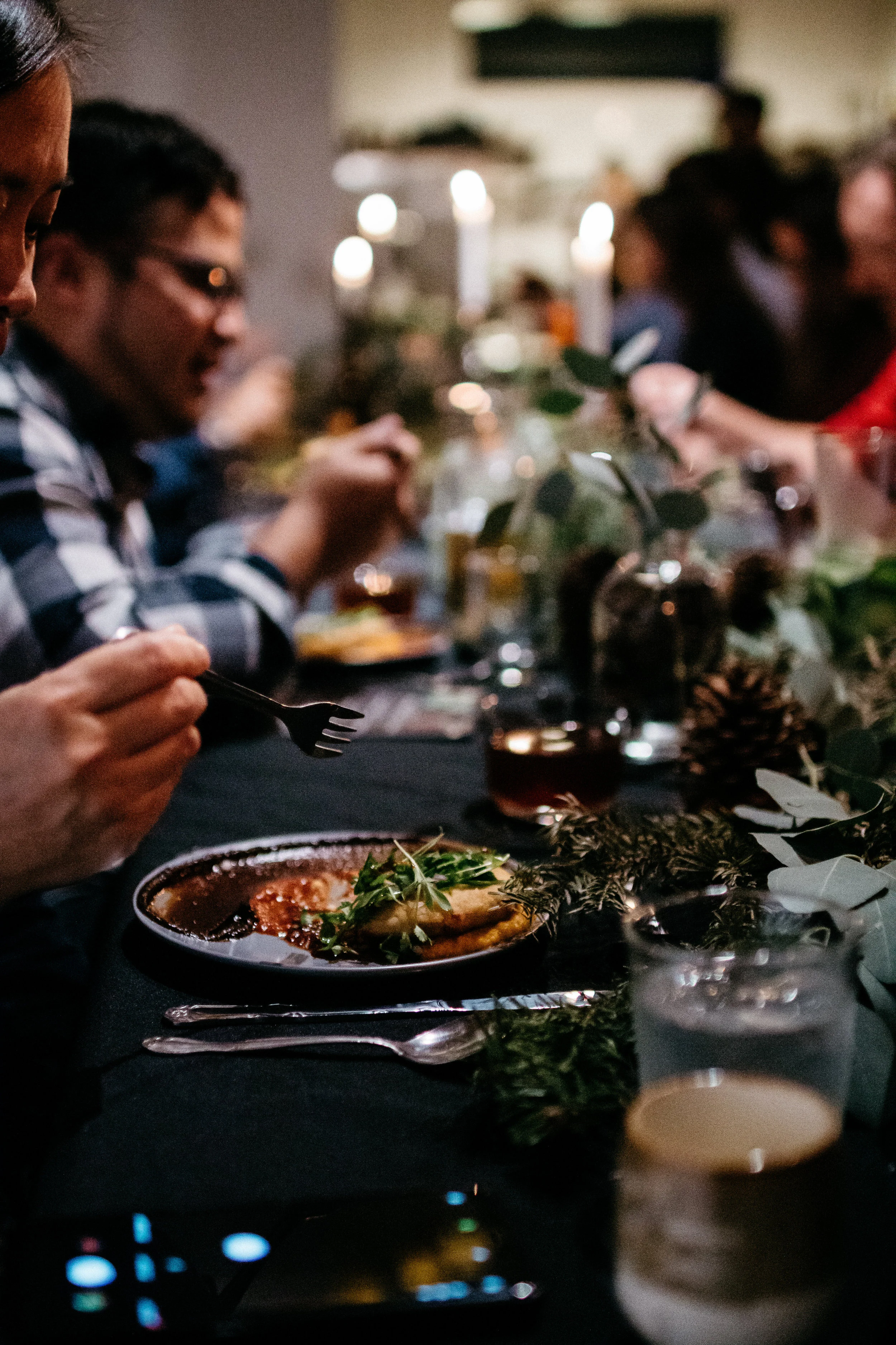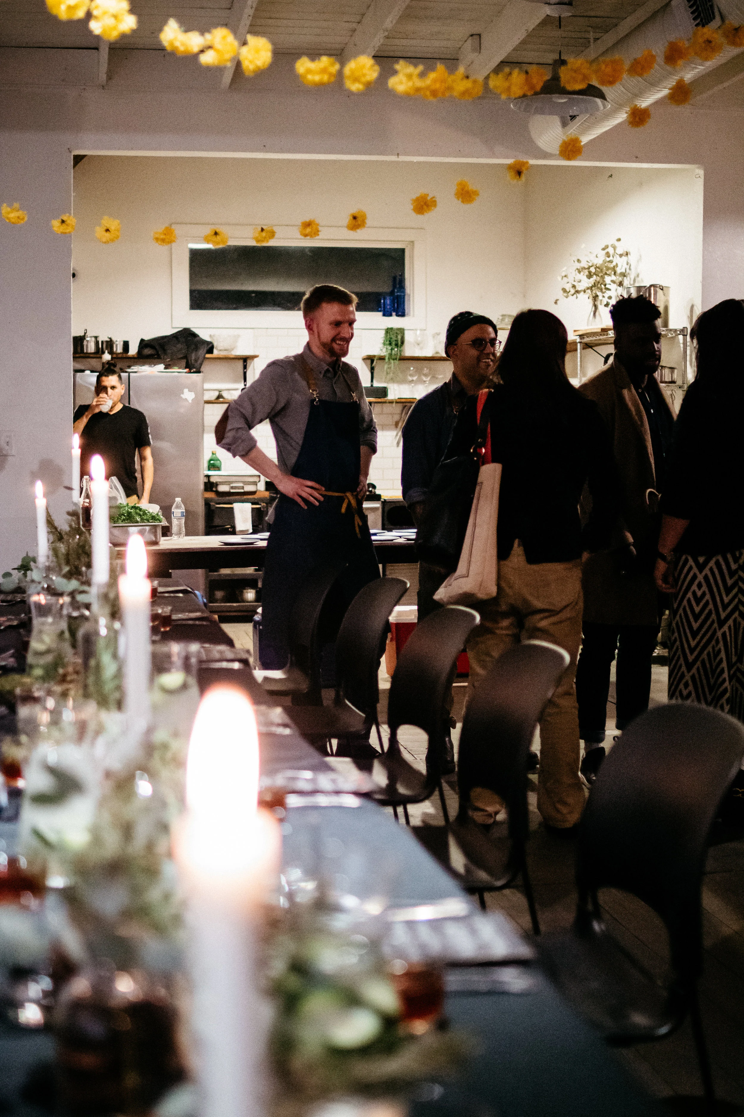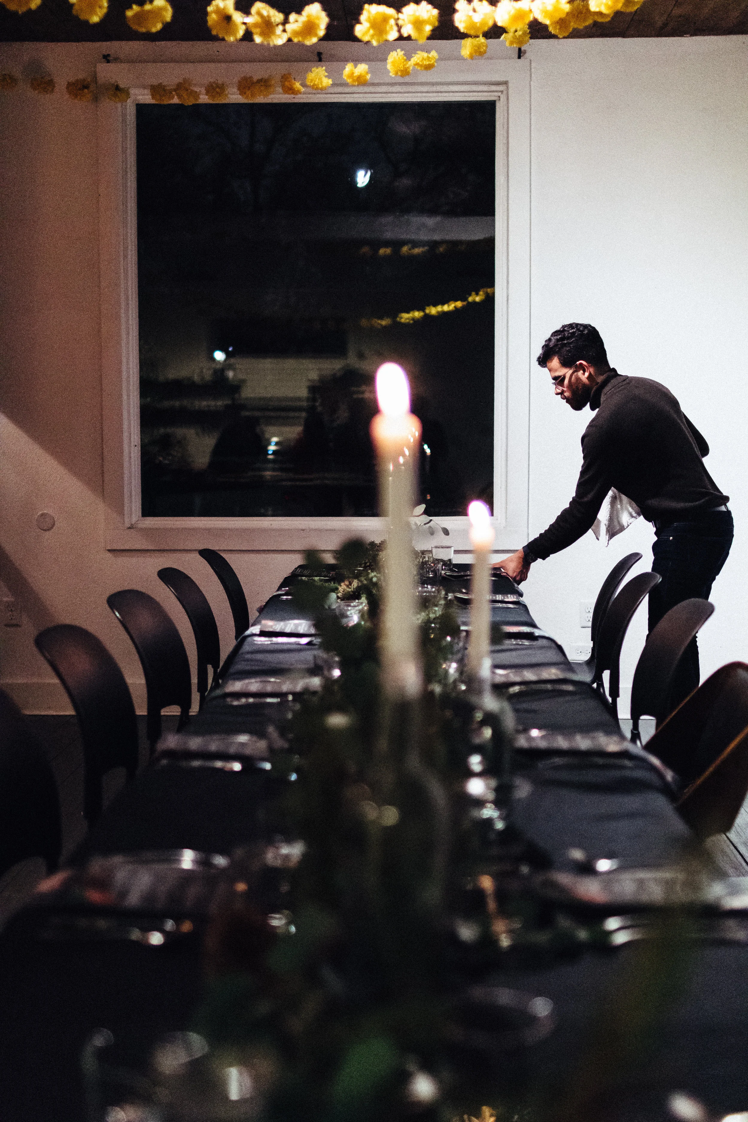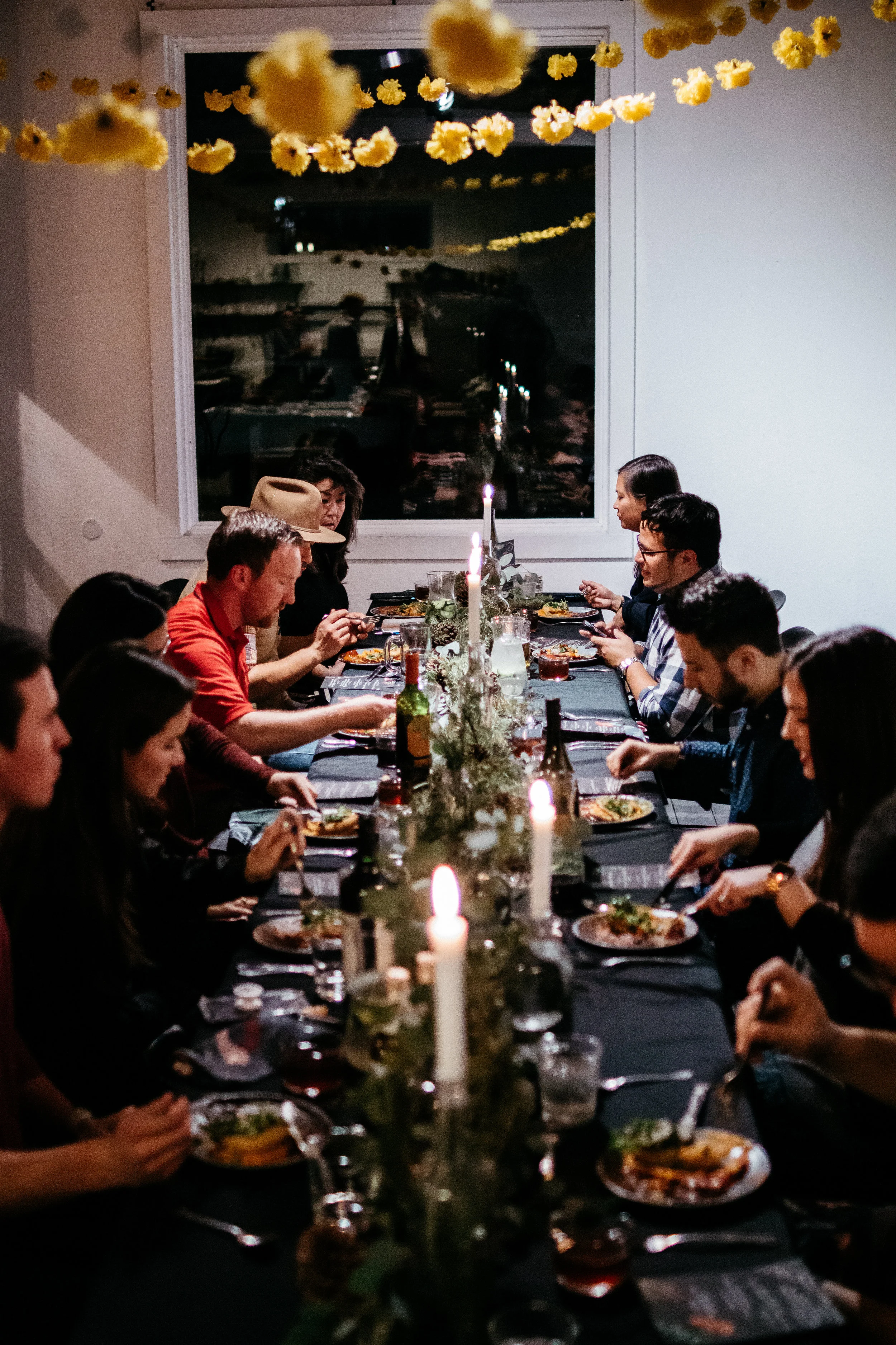 The design was based around the Spanish menu and the idea of having a christmasy feel to the event - without being too in-your-face-commercialized christmas. We landed on the muted tones of red, gold, tan, wine and a tones of green to be dusted in the pinata-inspired wall art, a slight nod to Ofrendas with the marigolds dangling from the ceilings, and hand painted menus to match the napkins - each featuring a totally different and unique design! Styling this dinner was one of my favorite projects to date!