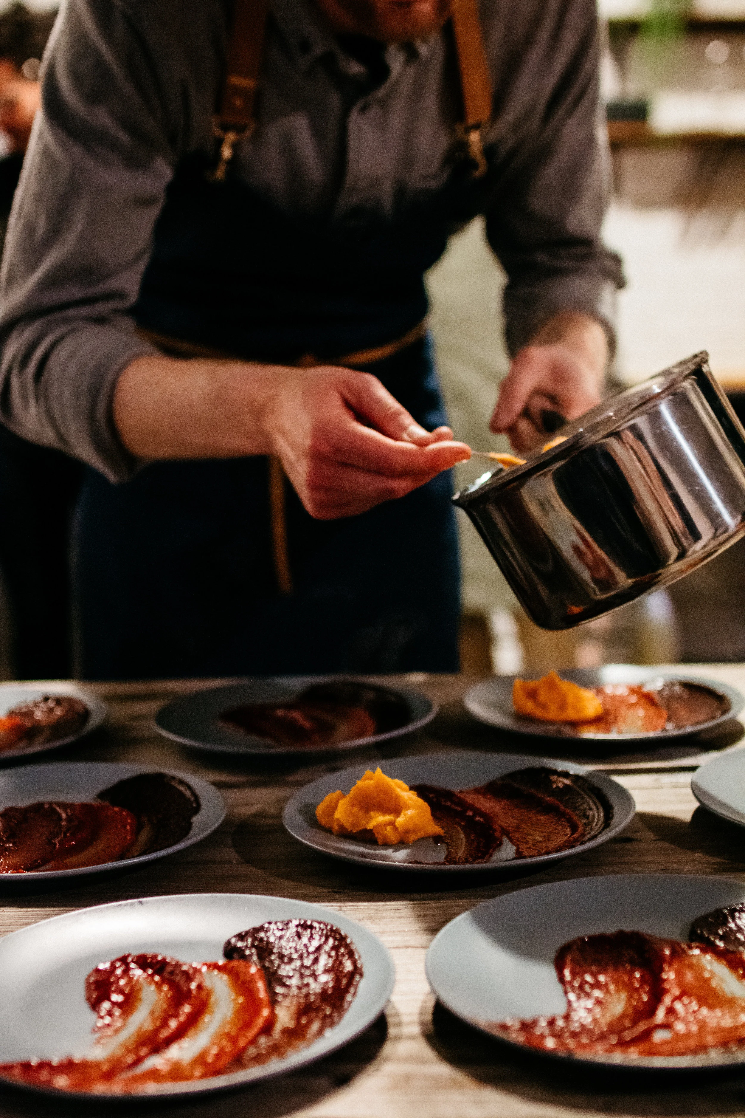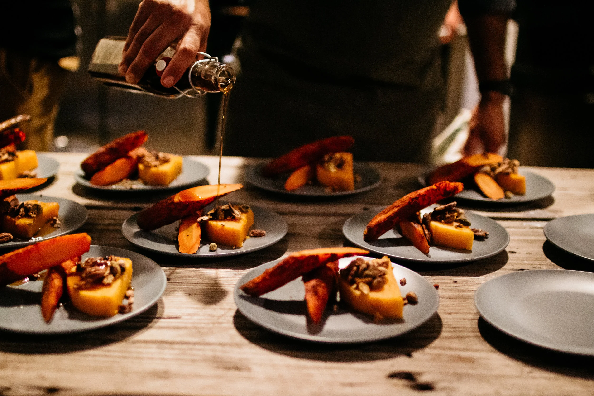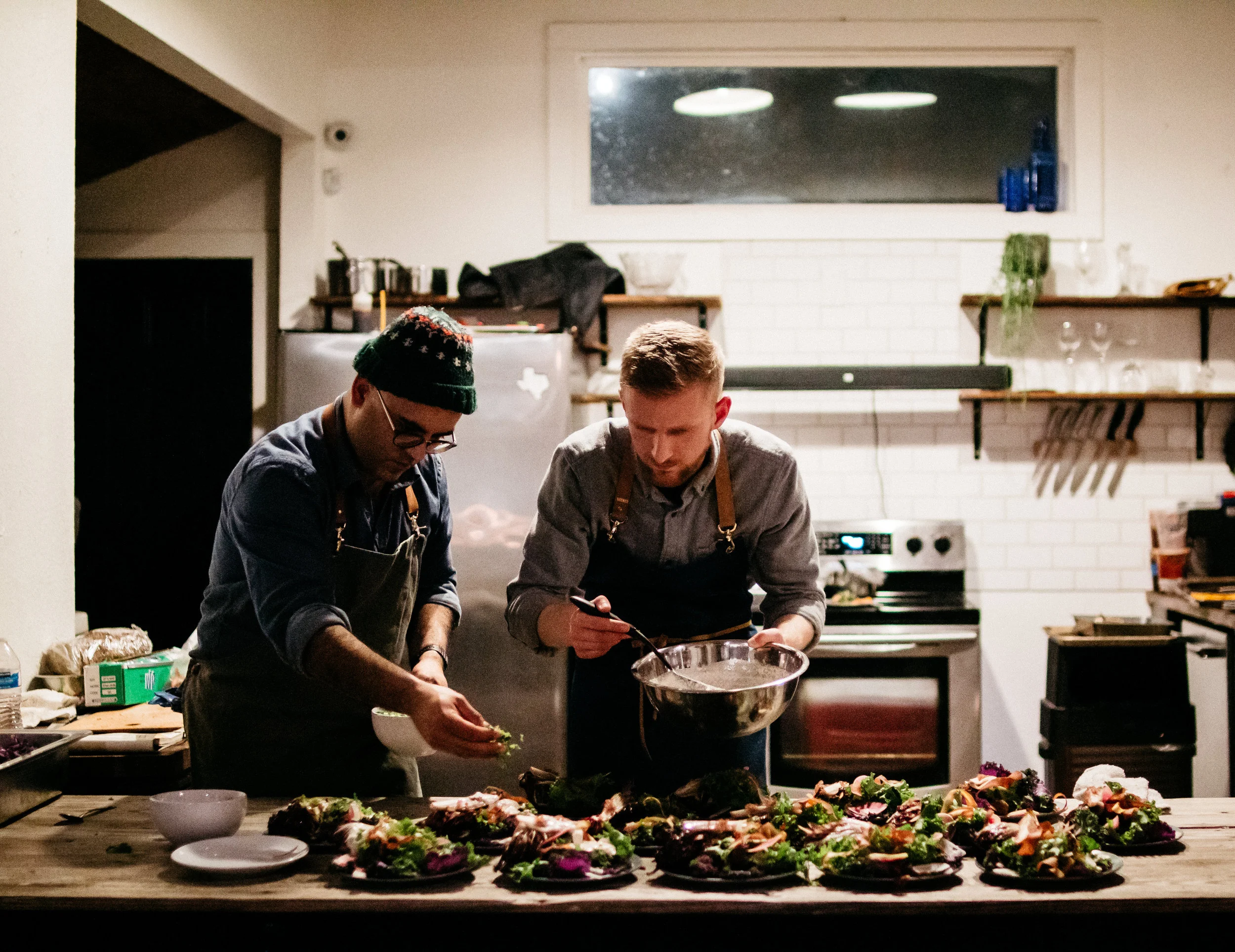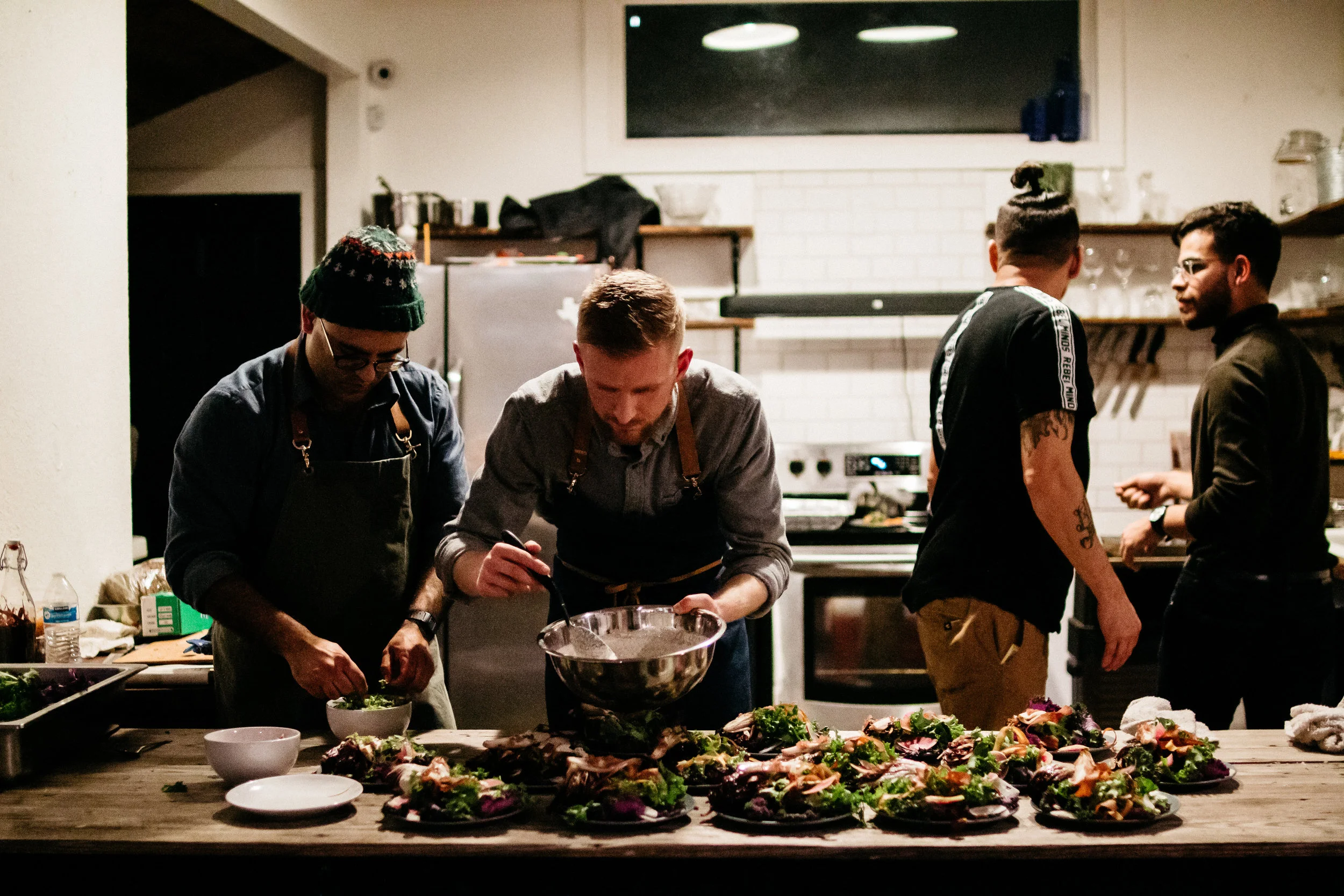 The design was based around the Spanish menu and the idea of having a christmasy feel to the event - without being too in-your-face-commercialized christmas. We landed on the muted tones of red, gold, tan, wine and a tones of green to be dusted in the pinata-inspired wall art, a slight nod to Ofrendas with the marigolds dangling from the ceilings, and hand painted menus to match the napkins - each featuring a totally different and unique design! Styling this dinner was one of my favorite projects to date!